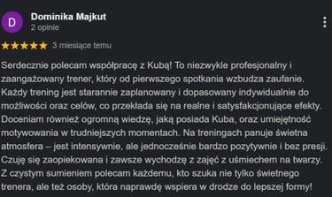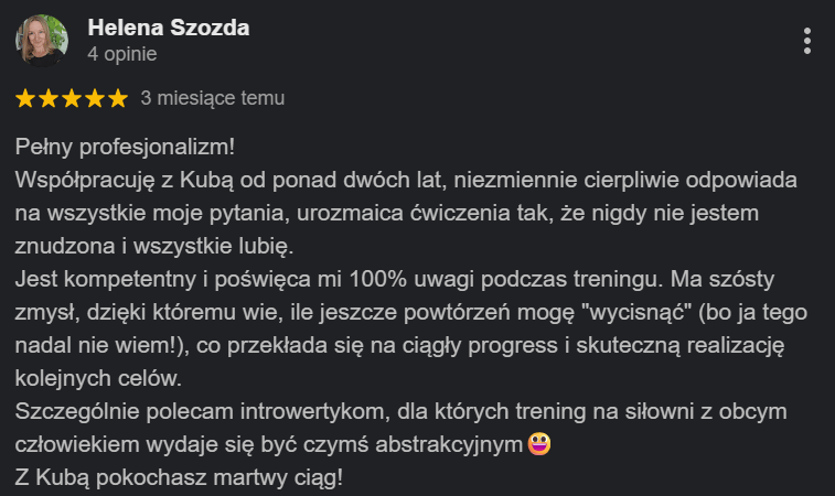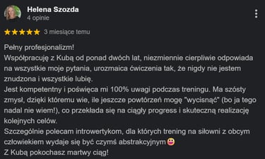 Wielu moich podopiecznych startowało z tym samym podejściem, jednak w trakcie całego procesu ich relacja z treningiem i aktywnością fizyczną się poprawiły. Być może nigdy nie ćwiczyłeś/aś w sposób, który Ci odpowiadał. Zawsze dbam o to, żeby trening poza zamierzonym efektem był dawał radość i satysfakcję.